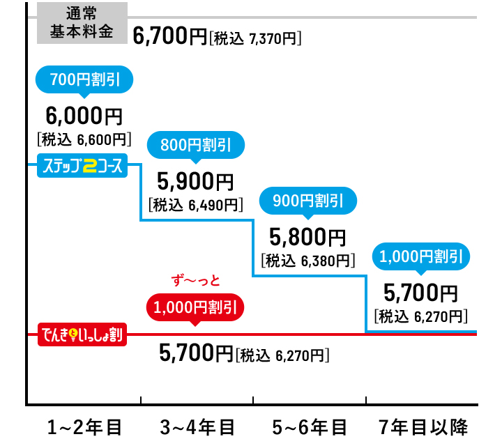 - 長期割引制度「ステップ2コース」、「でんきといっしょ割コース」の長割適用期間は2年間です。