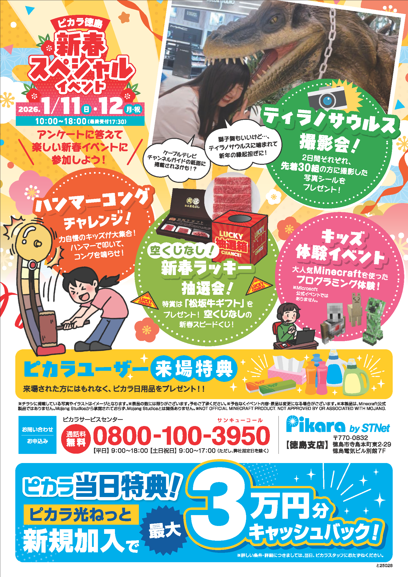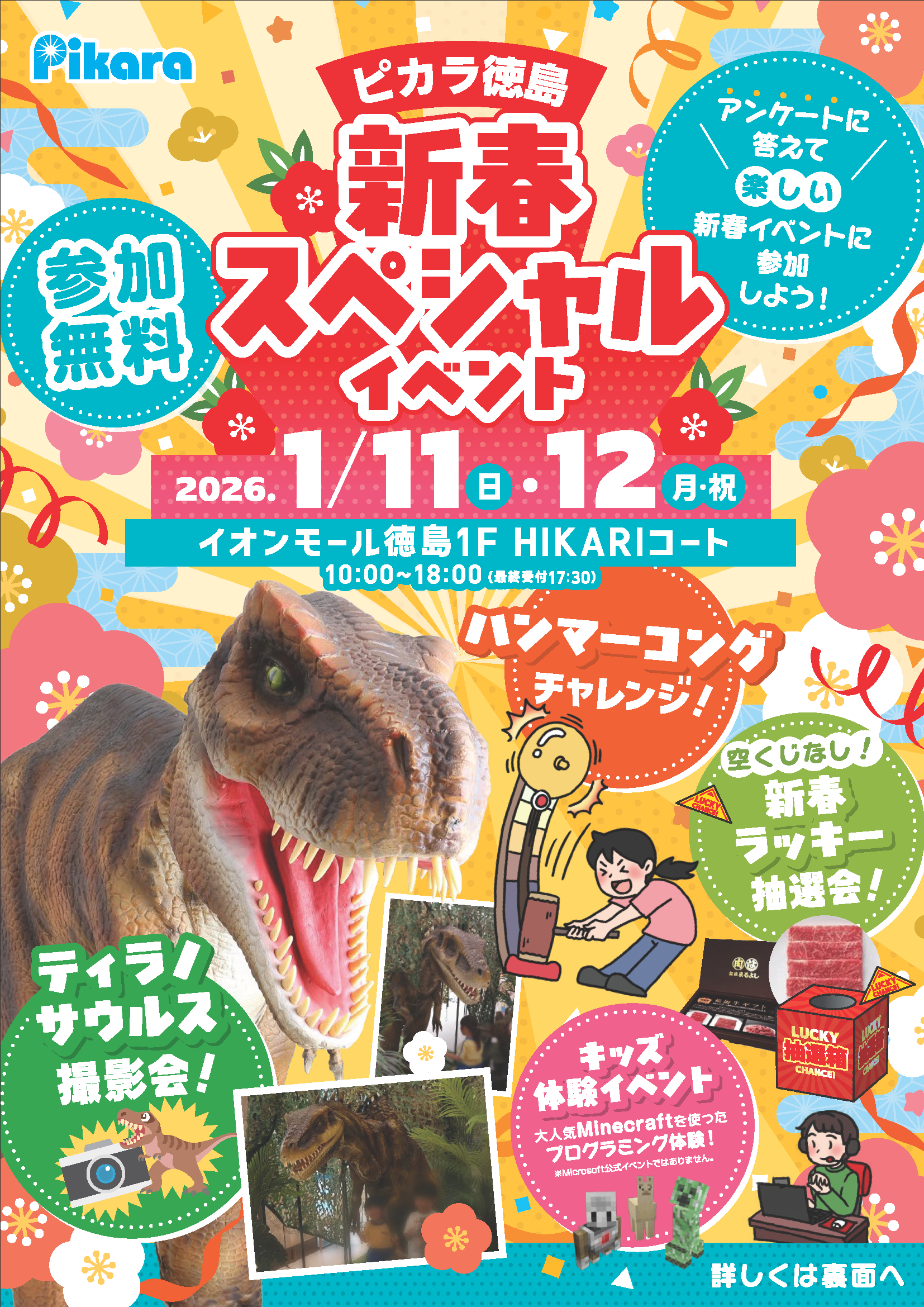 そのほかにも、空くじなしの「新春ラッキー抽選会」や「ハンマーコングチャレンジ」、展示された「ティラノサウルスとの撮影会」など、盛りだくさんの内容でお届けいたします。