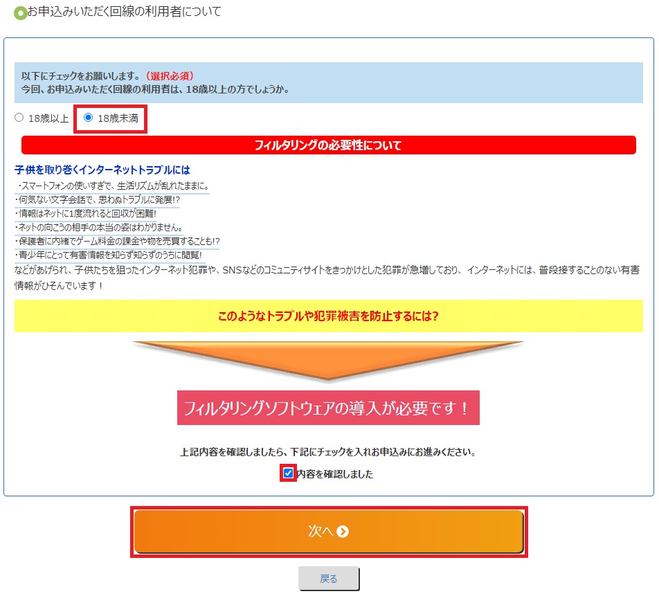 18歳未満の場合は、「フィルタリングの必要性について」をご確認のうえ「内容を確認しました」にチェックをし、「次へ」をタップ。